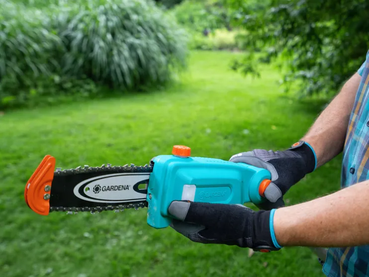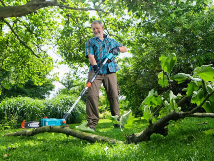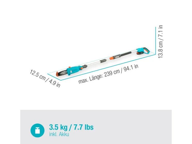 De GARDENA Accu-telescoop-hoogtesnoeier TCS 20/18V P4A wordt gebruikt om boomsnoei veilig vanaf de grond uit te voeren. Dankzij de telescopische steel is het uitlichten en onttasten tot een hoogte van 4 meter mogelijk. Dankzij de lichte en smalle snijkop kunnen ook takken op krappe plaatsen in de boomkroon moeiteloos worden verwijderd. De verstelbare snijkop zorgt voor extra comfort. Men kan ook comfortabel snoeiwerkzaamheden op de grond uitvoeren, bijvoorbeeld om takken in hanteerbare stukken te verhakselen. De snijaanslag aan de punt van het snijblad ondersteunt bij het snijden aan de onderkant van de takken, waardoor de accu-telescoophoogtesnoeier stabiel in de gewenste positie kan worden gehouden en tegelijkertijd de ketting wordt beschermd bij snoeien dicht bij de grond.
