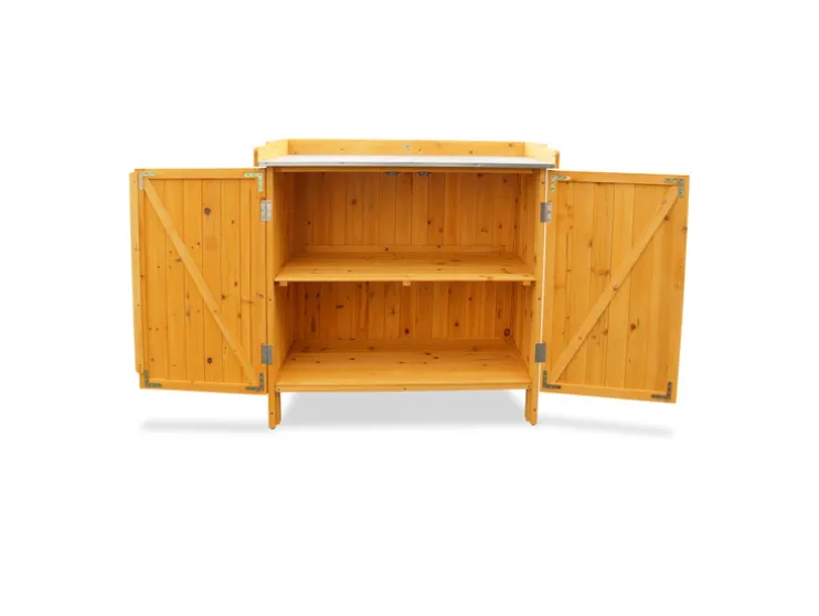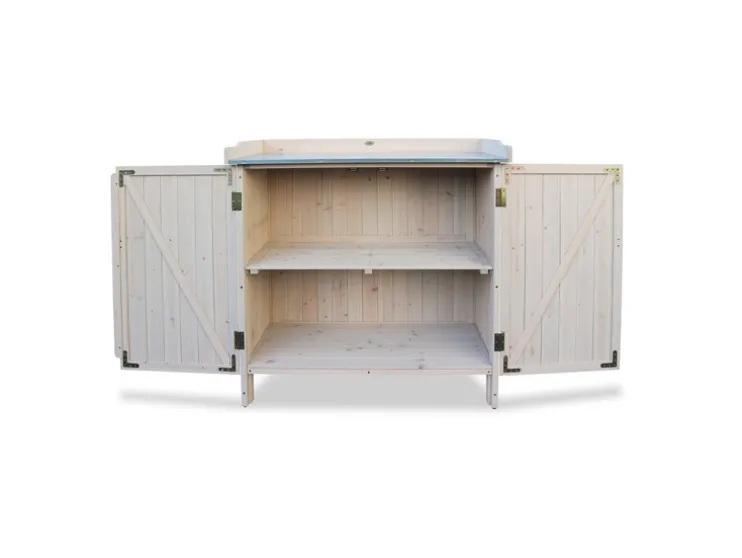 - De onderkast heeft deuren die met magneten worden gesloten en biedt genoeg ruimte voor tuinapparatuur
