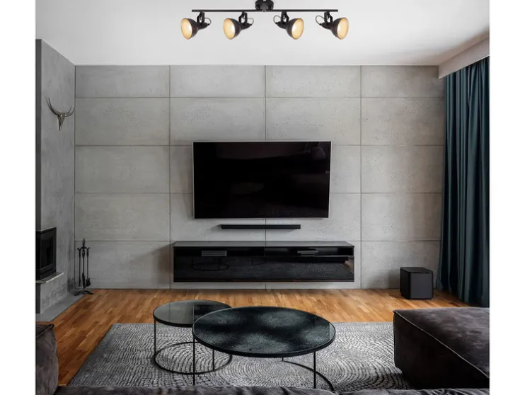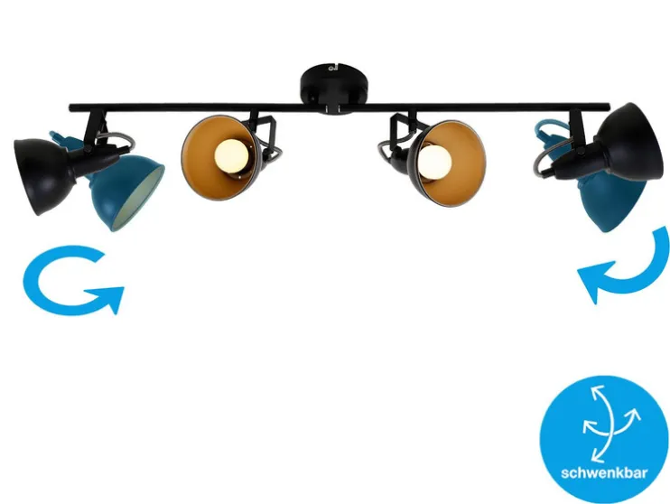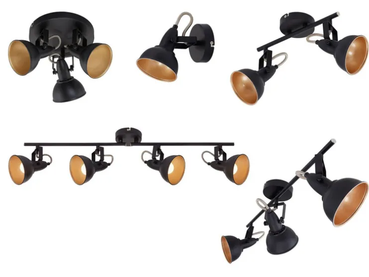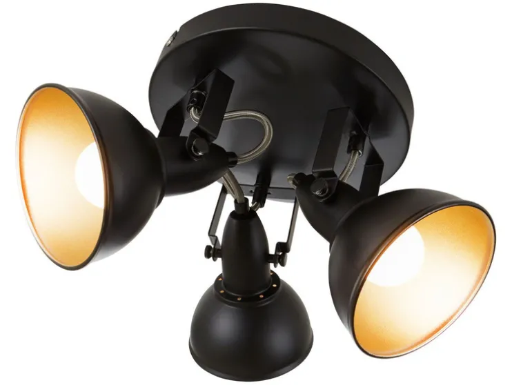 Moderne wand- en plafondlamp vervaardigd uit metaal. De spots in elegante retro/vintage-optiek zijn ideaal als woonkamerlamp of slaapkamerlamp. De stralers zijn draai- en zwenkbaar en dus individueel instelbaar. De lichtbronnen zijn niet inbegrepen. Het is natuurlijk mogelijk om LED-lampen te gebruiken met een aanzienlijk lager wattage. De lampenkappen zijn aan de buitenkant zwart en aan de binnenkant goudkleurig. De diameter van de lampenkappen bedraagt 105 mm.