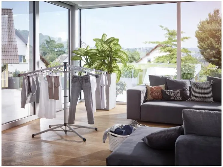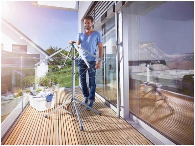 Met een hoogte van 95 cm biedt zelfs de buitenste lijn de mogelijkheid om lange wasstukken zoals badhanddoeken of broeken te drogen. De stabiele waslijnarmen en het brede opstelvlak zorgen, ook vol beladen, voor een veilige stand. Door op de bedieningshendel te drukken, kunnen de lijnen eenvoudig en comfortabel worden aangetrokken. Als de praktische wasdroogspin niet meer nodig is, kan hij net zo gemakkelijk worden gesloten als geopend: gewoon met één hand de vergrendeling ontgrendelen, tegelijkertijd de LinoPop-Up optillen en de armen klappen in elkaar.