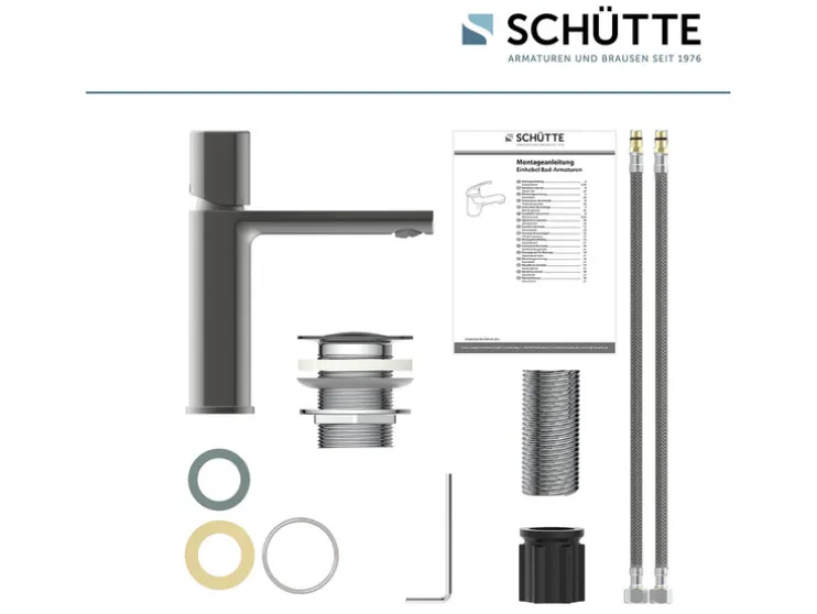 1 x wastafelarmatuur, 1 x afvoergarnituur met pop up afvoerplug in armaturenkleur, 2 x flexibele aansluitslang ca. 50 cm, 1 x snelle montage set, 1 x montagebeschrijving