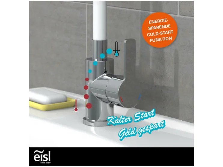 - Eenhendel mengkraan met Cold-Start techniek garandeert bij verticale positie van de bedieningshendel alleen de toevoer van koud water