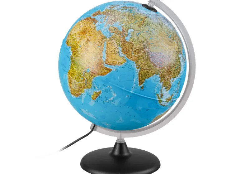 - De wereldbol geeft ook zeediepten en stromingen weer, inclusief oceanische bekkens en geulen