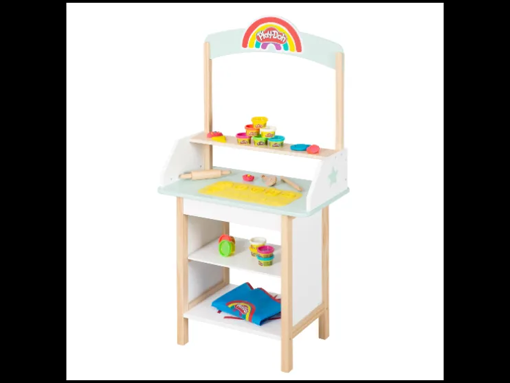 | Leveringsomvang: | Kraam, waterbestendig knutselschort, deegroller, pizzasnijder, modelleerwerktuig van FSC®-gecertificeerd hout, 3D creatieve speel- & knutselmat, 12x Play-Doh klei (2 potjes – ca. 28g in rood, geel, blauw, groen, wit, berry) |