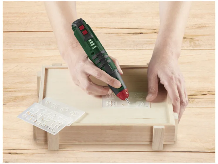 - Accu-graveermachine: 1x graveerpunt aus wolfraamstaal (vooraf geïnstalleerd), 5x graveersjablonen (1x letters, 1x cijfers, 3x symbolen), 1x 1,5 m USB-C-kabel (22 AWG)