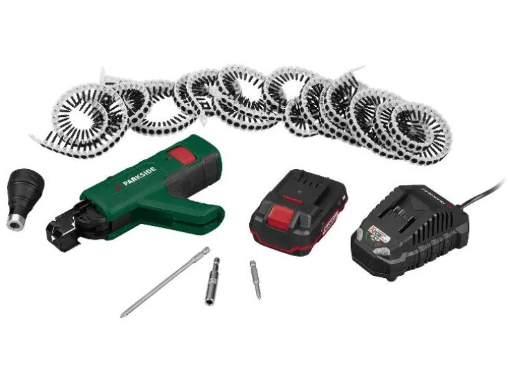 | Meegeleverde accessoires: | 1x magnetische bithouder (75 mm – voorgemonteerd) 1x PH2 schroevendraaibit (63 mm) 1x PH2-schroevendraaibit (148 mm – voorgemonteerd) 1x magazijnaansluiting (voorgemonteerd) 1x diepte-aanslag 10x schroefbanden 1x accu 1x lader |