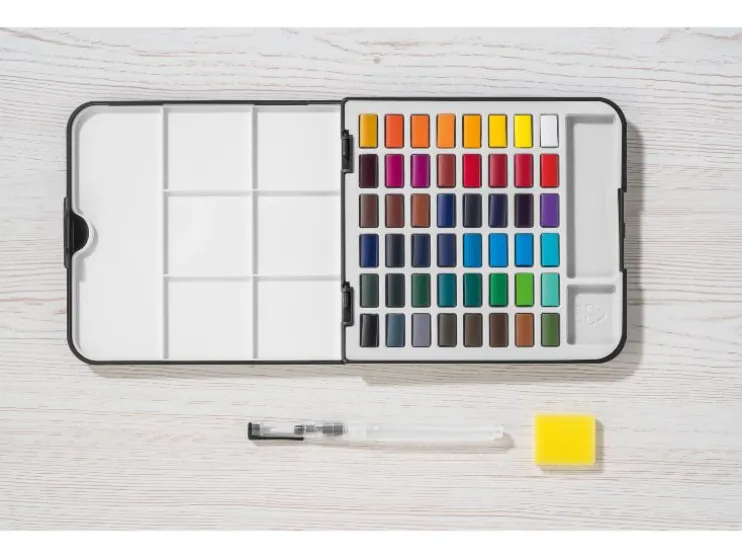 Begin direct met schilderen met deze complete 51 delige aquarelverf set. De set bevat 48 kleuren met een hoge lichtsterkte en slimme hulpmiddelen, zoals een watertankkwast. De compacte doos is praktisch en makkelijk om overal mee naartoe te nemen.