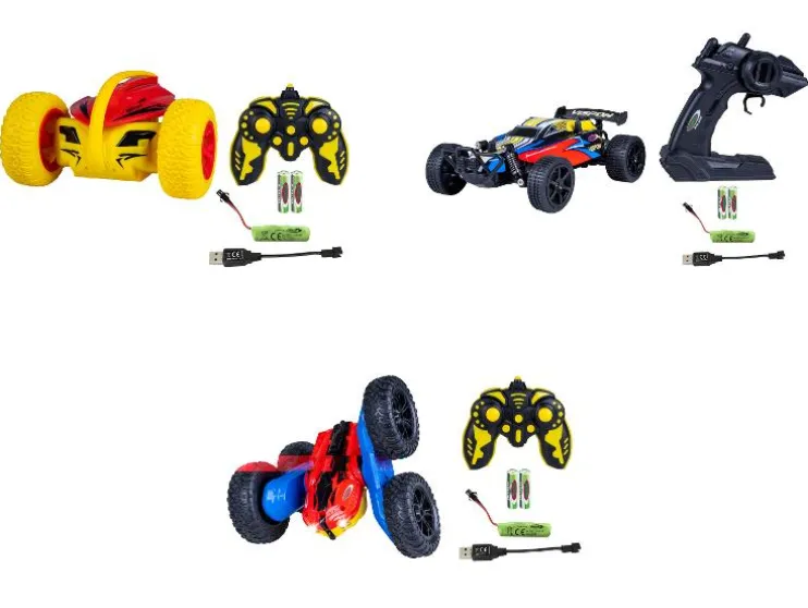 | Afmetingen: | RC X-F2 2,4 GHz: ca. 16,2 x 16,2 x 7,6 cm RC Vispon Buggy: ca. 22 x 13,8 x 7,7 cm RC SPINact stuntauto: ca. 21,6 x 18 x 7,2 cm |