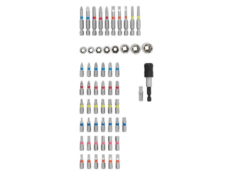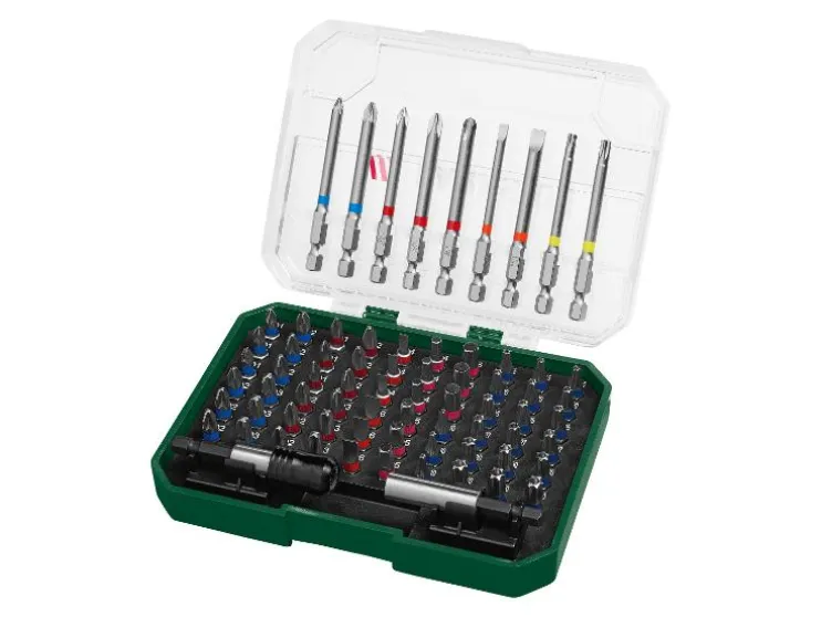 - 25-mm-bits: 12 x PH, 12 x PZ, 6 x sleuf, 21 x ster met gat, 9 x zeskant