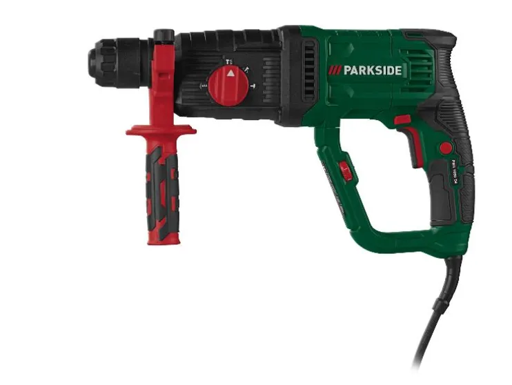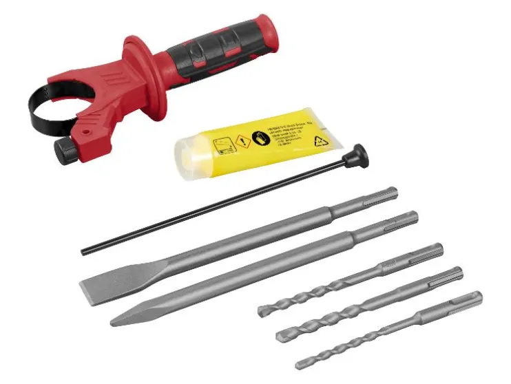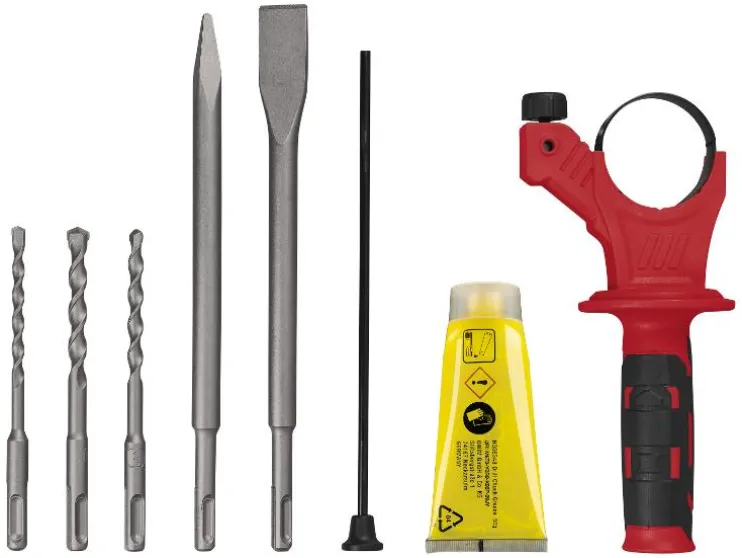 | Toebehoren: | 3x SDS-boren, 2x beitels – 1 x plat / 1 x spits, 1x metalen diepte-aanslag, 1x extra handgreep met Soft Grip, 50 g speciaalvet voor de smering van de boorkop |