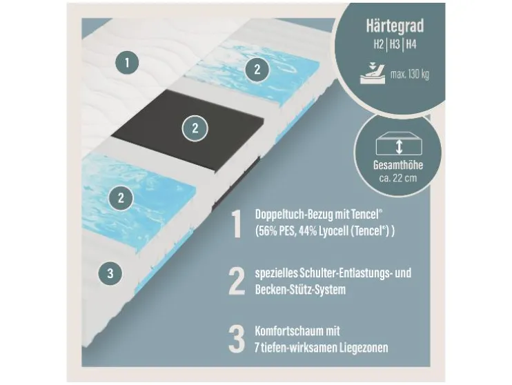 - Details/kenmerken 21 cm hoge comfortkern met 7 ligzones, met zeer flexibele gel-foam inserts aan beide zijden voor een zachte schouderzone en een extra bekkenondersteuningssysteem