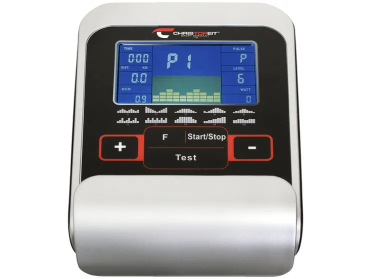- LCD-display met achtergrondverlichting, 6 schermen met gelijktijdige weergave van: tijd, snelheid, afstand, ca.calorieverbruik, pedaalomwenteling, watt en polsslag
