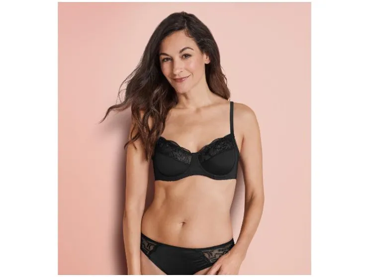 | Materiaal: | Breigoed: 86 % polyamide, 14 % elastaan (LYCRA®); Powernet: 88 % polyamide, 12 % elastaan (LYCRA®); Borduurwerkbasis/Charmeuse: 100 % polyamide; Borduurdraad: 100 % polyester |