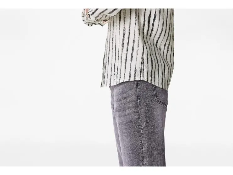 - Met een kraag, doorlopende knoopsluiting en afgeronde zoom