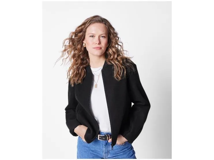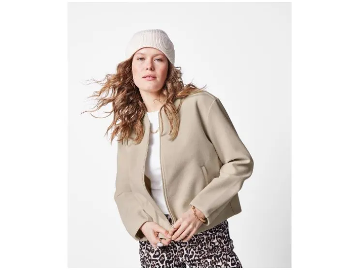 | Detail: | Geribde ronde hals en doorlopende rits |