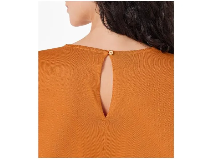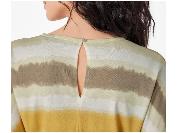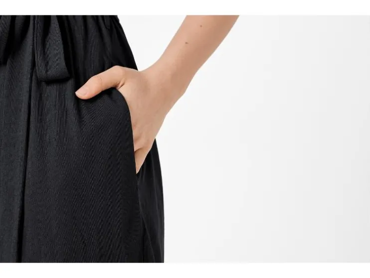 | Detail: | in wikkeloptiek met drukknoop aan de binnenkant, mouwen in omslagoptiek, taille met ceintuur en elastische band, steekzakken, rechte pijp, met split en knoop in de nek |