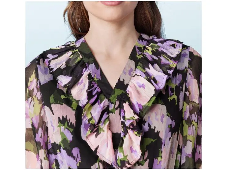 | Detail: | met speelse volants, in licht vloeiende chiffon kwaliteit, elastische tailleband, licht transparante mouwen met elastiek aan de uiteinden, ondoorzichtig gevoerd |