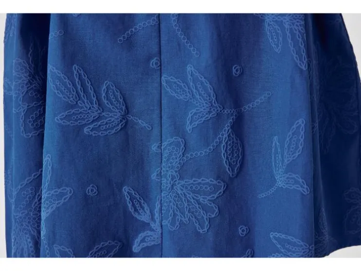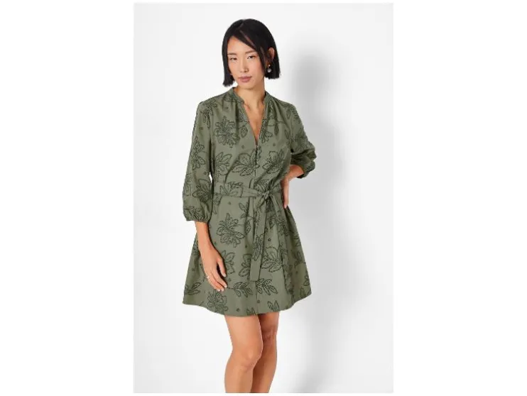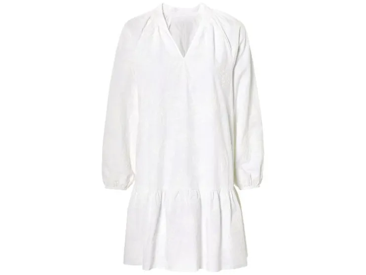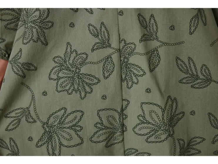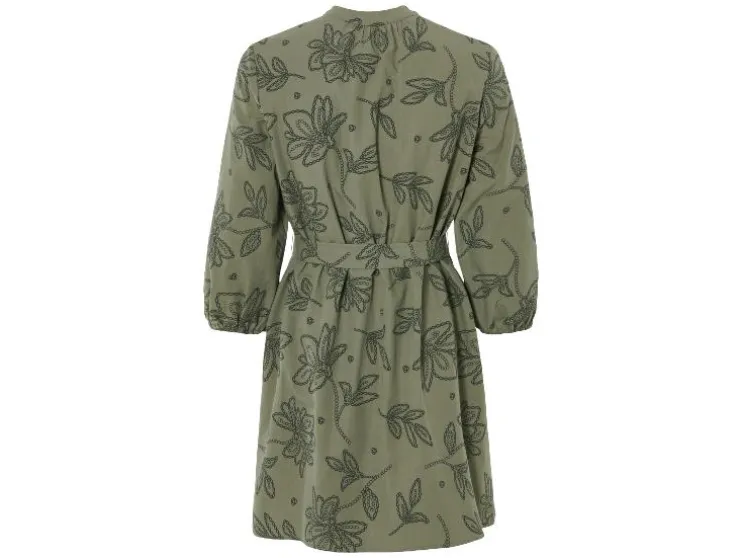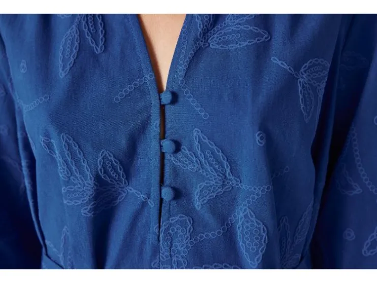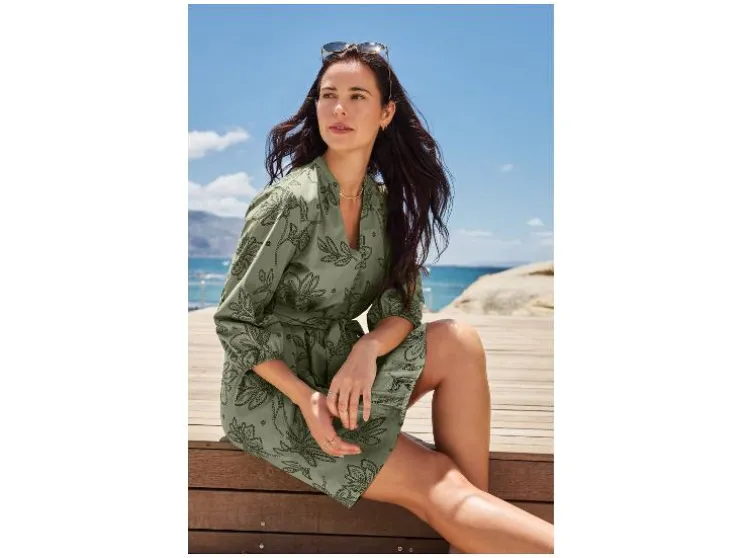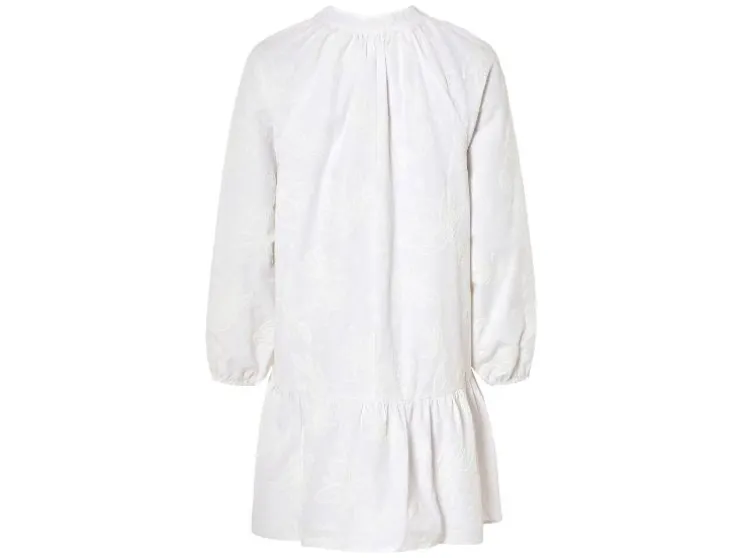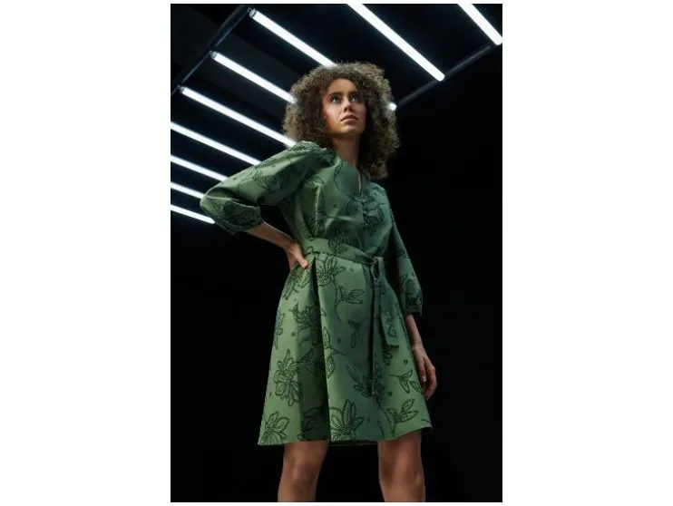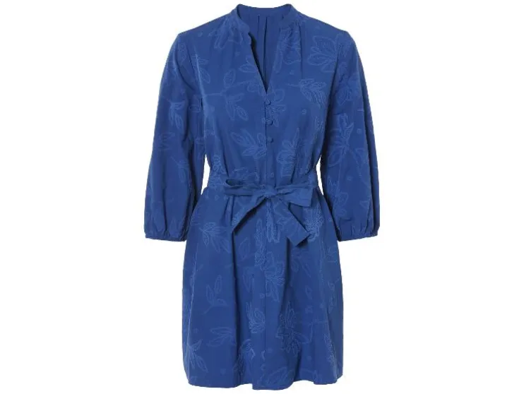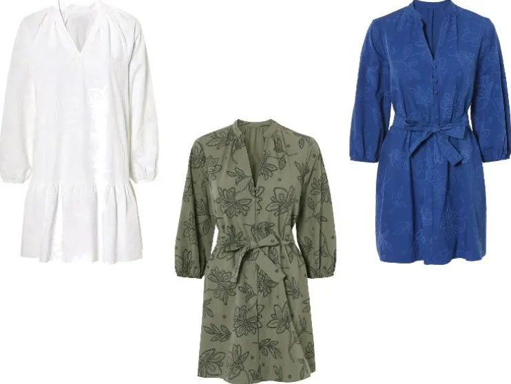 | Detail: | blauw, olijfgroen: puur katoen, doorlopende knoopsluiting, ballonmouwen, afneembare ceintuur; wit: hoog katoenaandeel met gerecycled materiaal, ballonmouwen |
