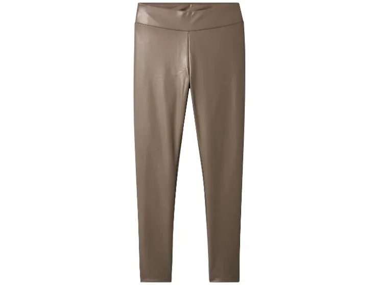 - Deze legging in leerlook heeft een brede tailleband en een normale taillehoogte