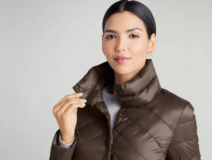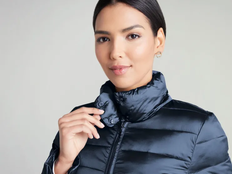 - Met hoge opstaande kraag en doorlopende ritssluiting