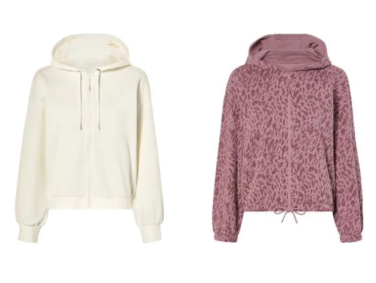 | Detail: | met overgeslagen schouders, zachte sweat-kwaliteit met geruwde binnenkant, boordjes aan de mouw- en zoom afwerking, roze: capuchon en koord aan de zoom; wit: capuchon met koord |