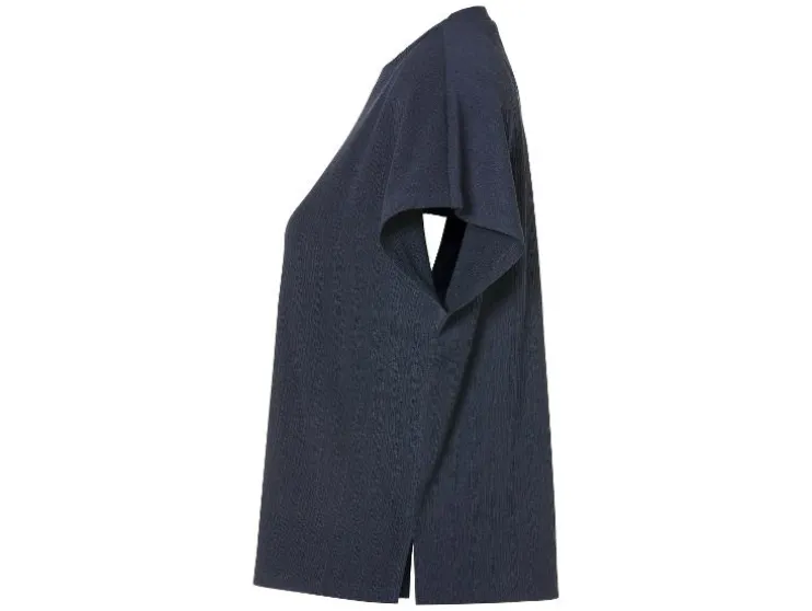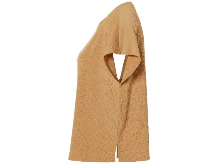 - Camel, marineblauw: casual met overgeslagen schouders en ronde hals
