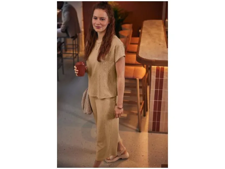 - Beige: casual met overgeslagen schouders en wijde ronde hals