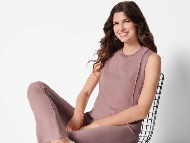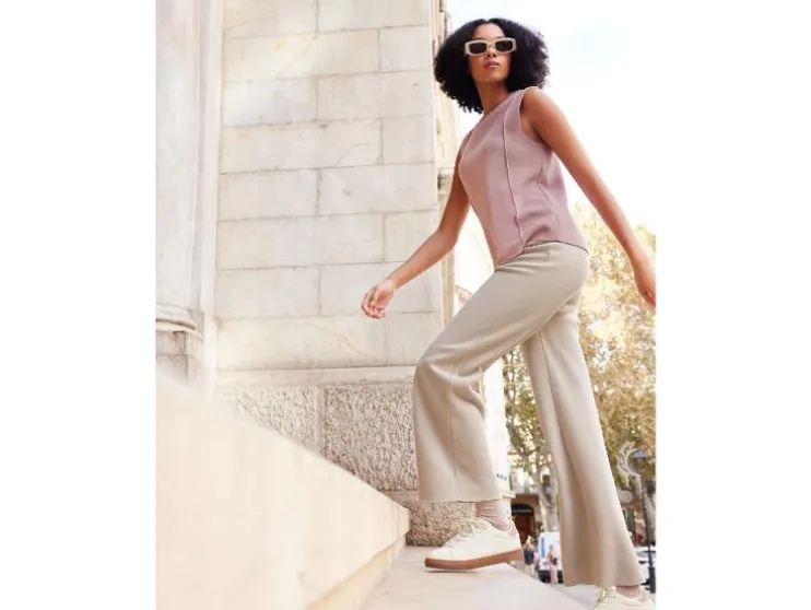 - Beige, roze: rechte pasvorm met geribbelde ronde hals