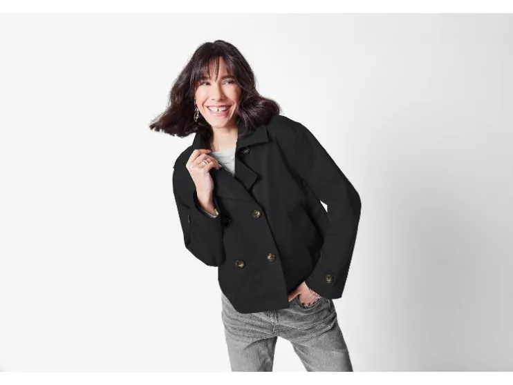 - Brede reverskraag en dubbele knoopsluiting met binnenknoop