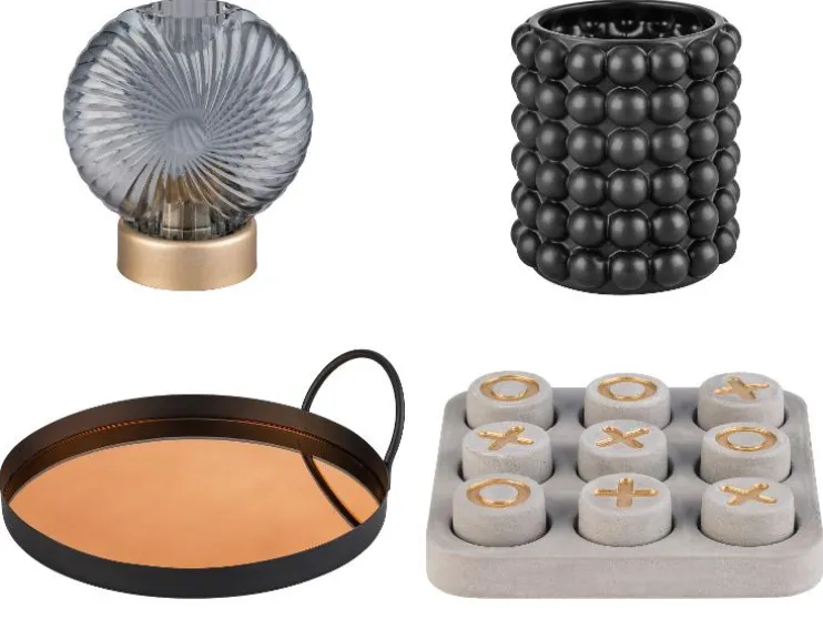 Kaarsenhouder, vaas, metalen schaal, Tic Tac Toe-spel