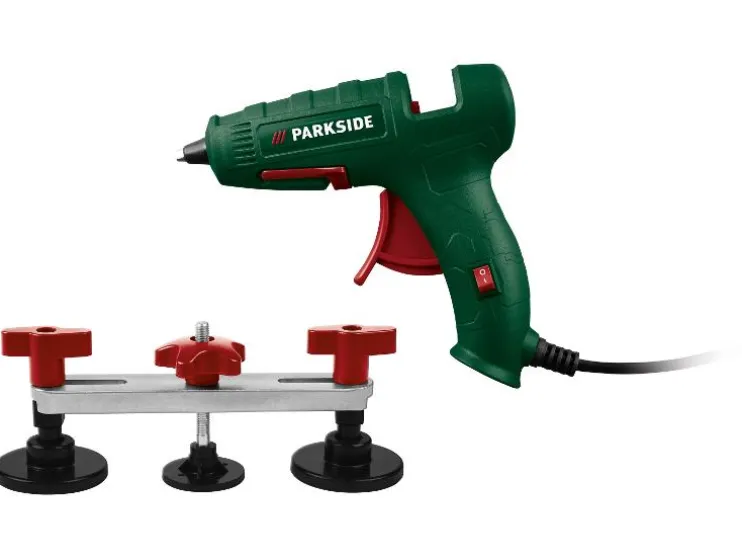 | Afmetingen: | Lijmpistool: ca. L 143 x B 140 x H 36 mm Deukreparatiehaak: ca. L 142 x B 24 x H 10 mm |