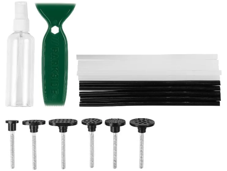- Bevat: 1 reparatiehaak met schroefgreep, 7 verschillende trekplaten, 1 hetelijmpistool, 10 lijmstiften, 1 lijmschraper, 1 reinigingsmiddelspuitfles (zonder inhoud)