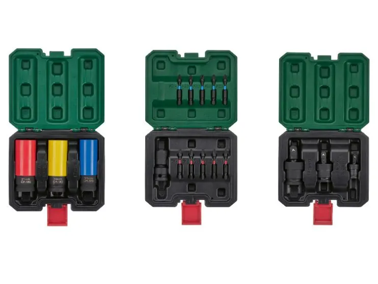| Afmetingen: | Slagmoerset: Slagmoeren: ca. 1,25 cm (1/2″) 1,7 / 1,9 / 2,1 cm; Box: ca. 14,9 x 12,8 x 4,9 cm; Slagmoersleuteladapter met torsiebits: Bitadapter: ca. 5 x 2,3 cm; Bits: ca. 5 cm; Box: ca. 14,9 x 12,8 x 4,9 cm; Kogelgewricht set: kogelgewricht (1/4″): ca. 4,4 cm; kogelgewricht (3/8″): ca. 6 cm; kogelgewricht (1/2″): ca. 8,1 cm; Opbergbox: ca. 14,8 x 12,9 x 5 cm |