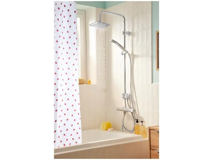- Toebehoren: pluggen (ca. Ø 6 mm), handdouche, waterbesparende afdichting, afdichting, doucheslang handdouche (ca. 150 cm), doucheslang kraan (ca. 80 cm), omschakelaar, afdekdop (voorgemonteerd), kunststofschroef (voorgemonteerd), schroef, bevestigingselement, handdouchehouder, hoofddouche met voorgemonteerde afdichting, douchestraal, wandbevestiging, afdekking