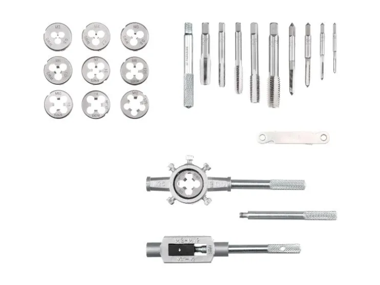 | Inhoud: | 1x verstelbare wringijzer M3–M12 (1/8″–1/2″) met stalen bekken (max. 5 mm) 1x snijplaathouder M25 (1″) 9x snijplaten (M3/M4/M5/M6/M7/M8/M10/M12 & 1/8″) 9x draadtappen (M3/M4/M5/M6/M7/M8/M10/M12 & 1/8″) 1x draadmal |