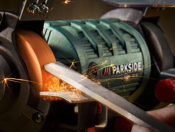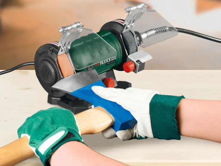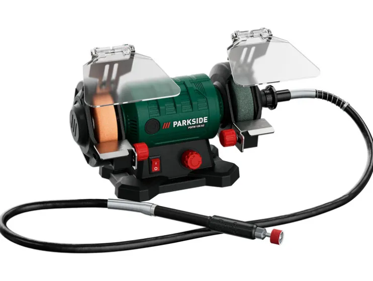 - De machine heeft 2 voorgemonteerde schijven met een diameter van 75 mm en een breedte van 20 mm (1 schuurschijf, 1 polijstschijf)