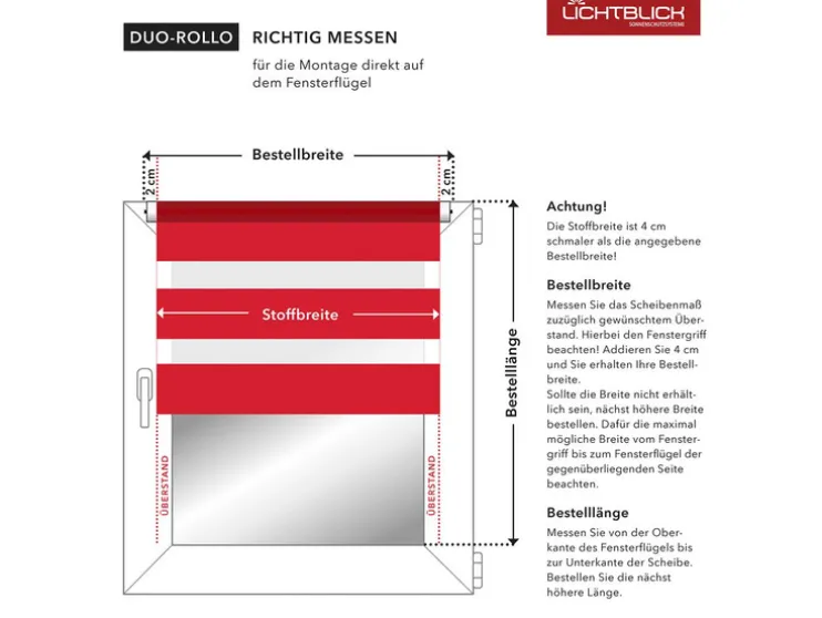De bestelbreedte geeft de totale breedte van het rolgordijn aan – de stof is altijd 4 cm smaller dan de opgegeven bestelbreedte!