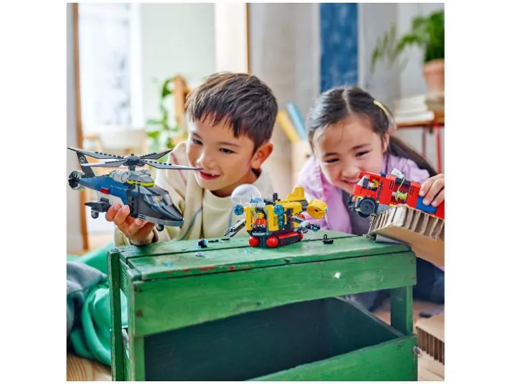 Deze LEGO® City set biedt drie voertuigen in één: een helikopter, een brandweerwagen en een onderzeeër. Kinderen kunnen ze bouwen, combineren en hun eigen missies bedenken.