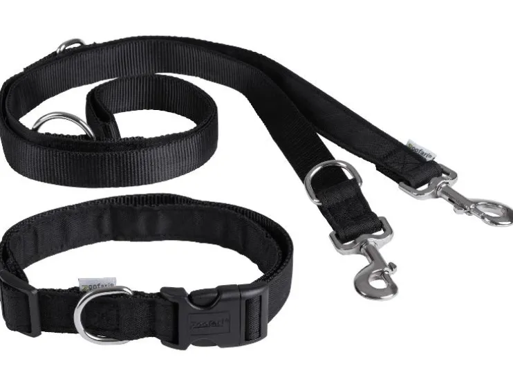 - In de lengte verstelbare hondenlijn met karabijnhaak met draaipunt en drie D-ringen