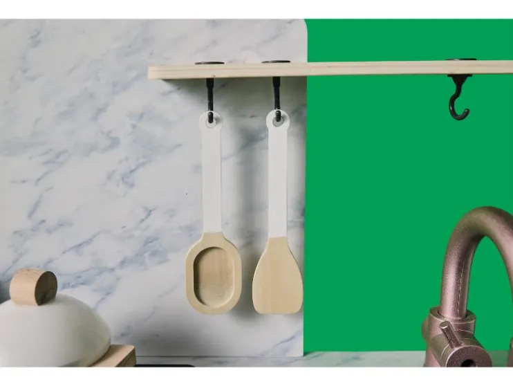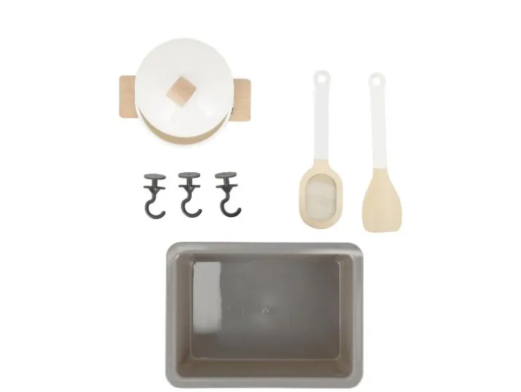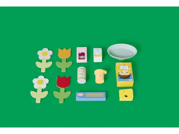 | Leveringsomvang: | Keuken: 1x spatel, 1x pollepel, 1x kookpan, 3x haken voor accessoires Winkel: 1x kassa (incl. speelgeld en klantenkaart), 1x weegschaal, 1x boodschappentas, 4x planten, 1x melk, 1x stuk kaas, 1x yoghurt, 1x pasta, 1x rijst, 1x erwten, 1x kartonnen doos, 1x bord |