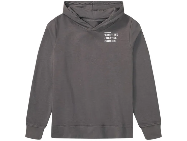 | Detail: | Capuchon, boorden aan mouw- en zoomuiteinden, rugprint op grijze variant |