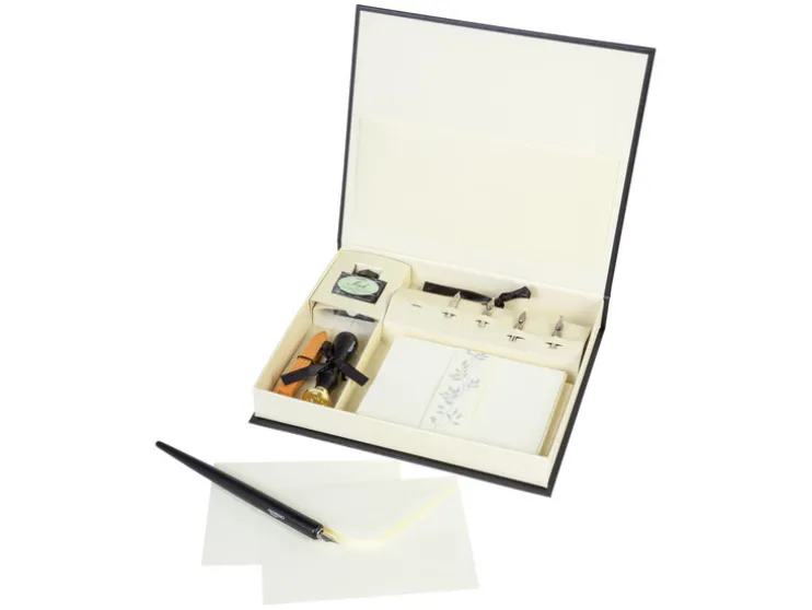 1 houten pen, 5 kalligrafie penpunten van hoge kwaliteit, 1 potje blauwe inkt, 1 zegelstempel met filigraan motief, 1 stang zegellak, 10 gevouwen kaarten met enveloppen, 1 stevige opbergdoos