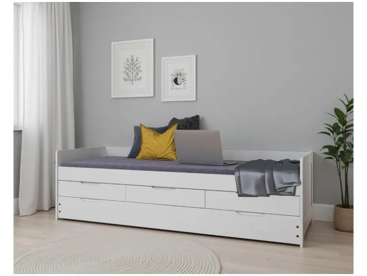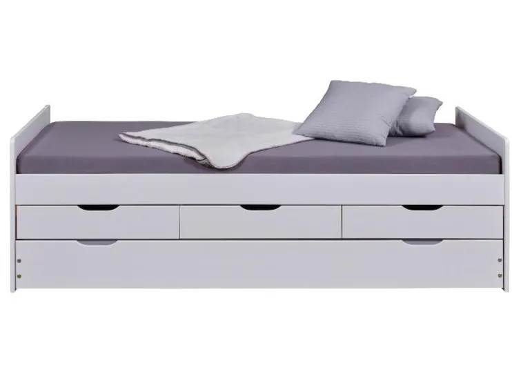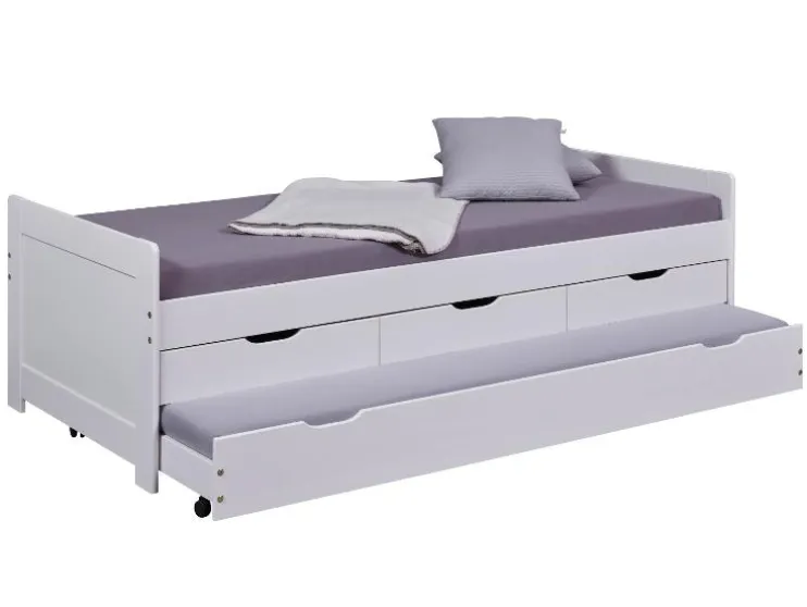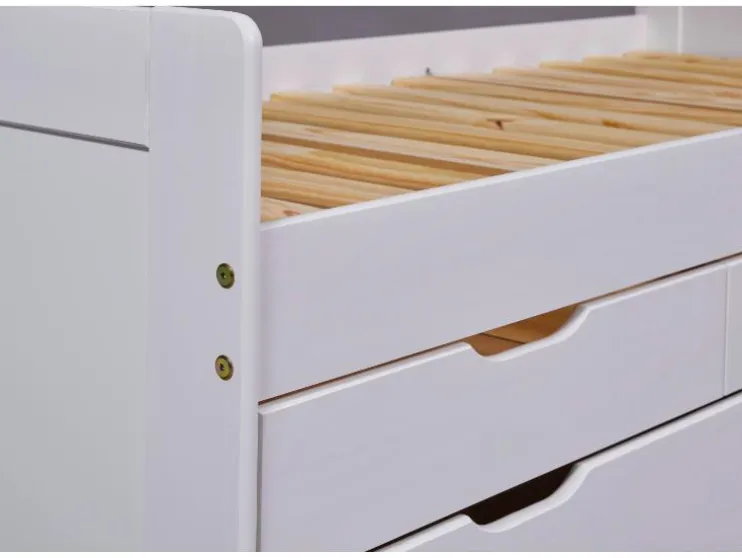 Het bed Desert Rain van wit gelakt massief dennenhout overtuigt door veel opbergruimte en slimme functies. Ideaal voor kinder-, jeugd- of gastenkamers.