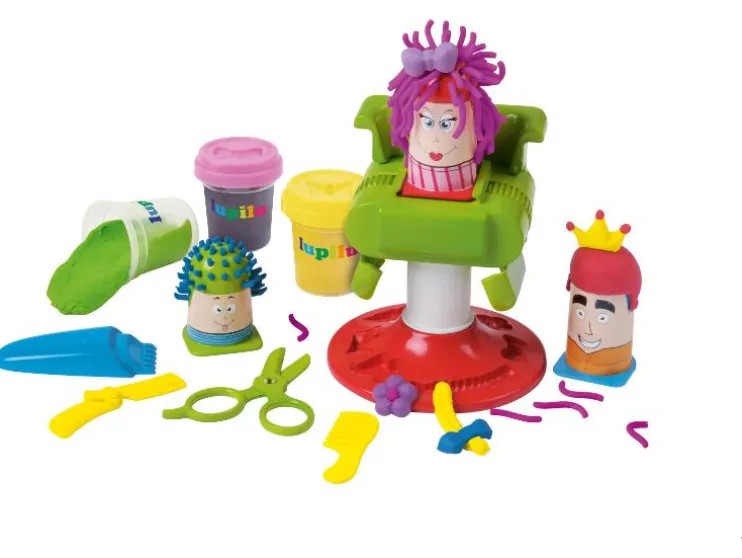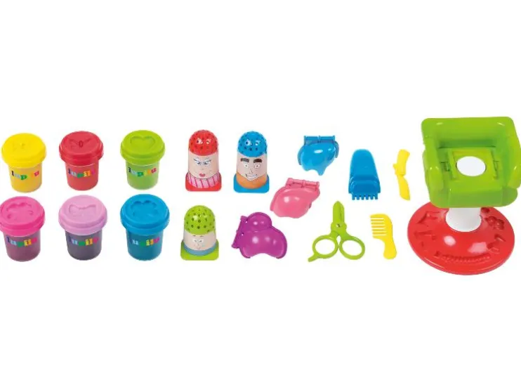 - Uitgebreide accessoires: 3 modelleerpoppen, 1 kappersstoel, 1 kleischaar, 1 haartrimmer, 1 scheermes, 1 kam, 3 kapseluitsteekvormpjes