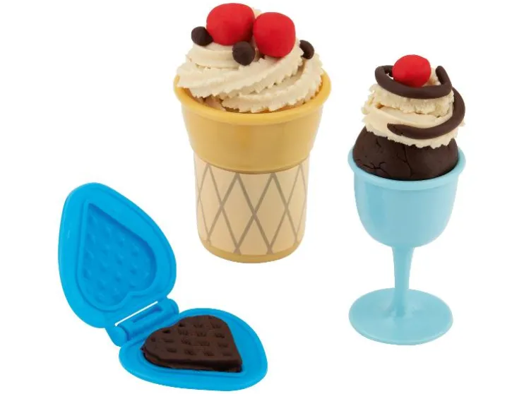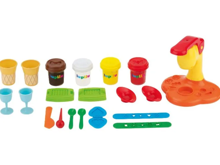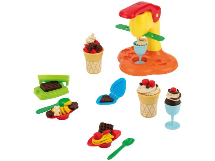 - Uitgebreide accessoires: 1 ijsmachine, 2 schuifjes met verschillende designs, 2 ijsbekers, 2 schaaltjes, 2 lepels, 1 wafelvorm rechthoekig, 1 hartwafelvorm, 1 modelleermes, 1 modelleercutter, 2 wafelbekers
