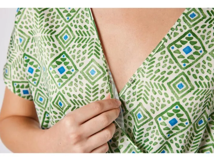 | Detail: | Satijnen kwaliteit, zijzakken groen, olijfgroen: in wikkeloptiek Drukknoop in het decolleté Elastische tailleband limegroen: Licht gerimpelde mouwen Knoop en split in de nek Elastische tailleband met koord |