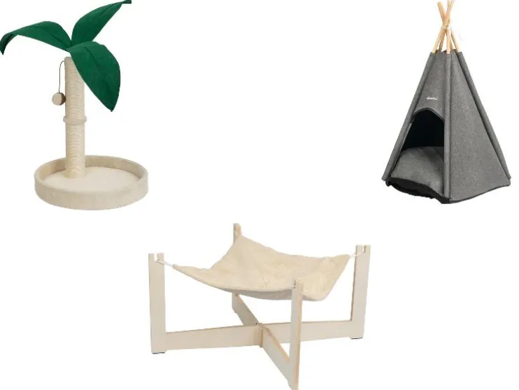 | Materiaal: | Krabpaal: Cilinder binnenkant: Kunststof Cilinder buitenkant: Sisal Palmbladen: Vlies Hangmat: Hout: Spaanplaat Stof: Kunststof Tipi: Stokken: Grenen Stoffen hoes, kussen: Kunststof |