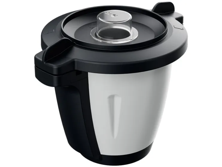 Mengkom met deksel en vulopening, stoomopzetstuk met deksel, kunststof mesinzet, roerinzet, spatel, maatbeker