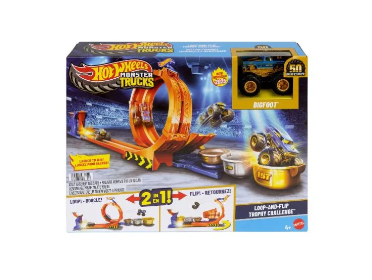 | Leveringsomvang: | 1 Hot Wheels Monster Trucks Loop & Flip Trophy Challenge en 1 Hot Wheels Monster Trucks Die-Cast-Bigfoot voor het 50-jarig jubileum |