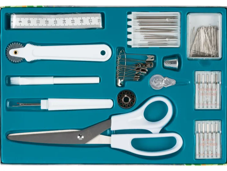- 1x naaigarendoos met 216x klossen à 50 cm in 24 verschillende kleuren en diverse knopen en banden